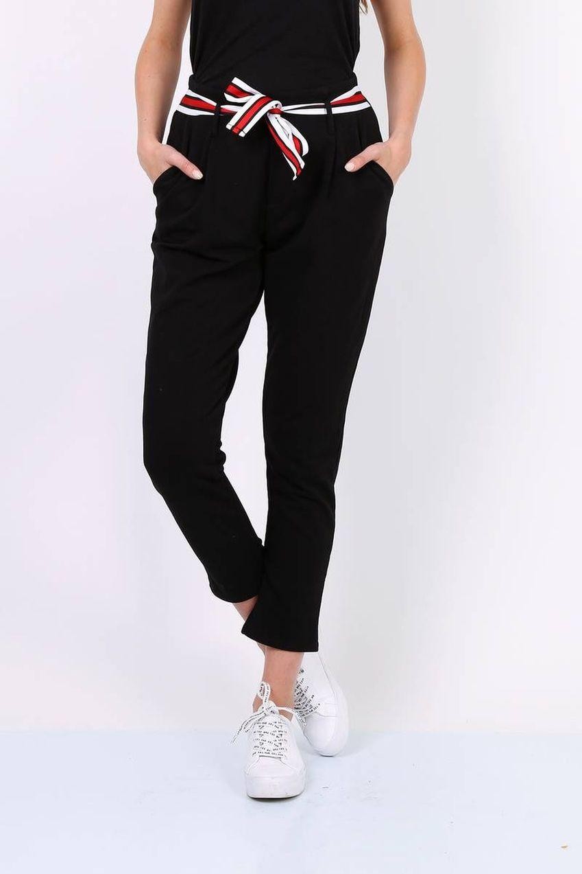 Pantalon élégant, droit avec une ceinture tricolore, blanche, rouge et noire. 2 poches plaquées sur les côtés et des pinces devant. Matière jogging, on est super bien dedans ! Elastique au dos, vous serz chic tout en étant à l'aise. 85% coton, 10% polyester, 5% élasthanne.